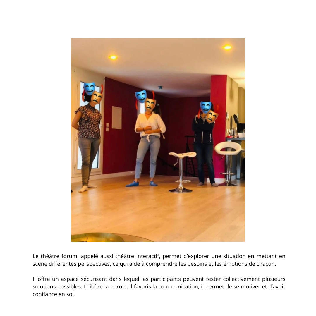 Je crois profondément au pouvoir du langage utilisé, de la parole, du jeu et de la mise en scène pour trouver des solutions auxquelles vous n'auriez pas forcément pensé. Pour faire comprendre à l'autre ce que vous ressentez vraiment. Intervenante en théâtre interactif, je propose un espace sécurisant, respectueux et bienveillant où chacun peut explorer ses émotions, et expérimenter d'autres possibilités.