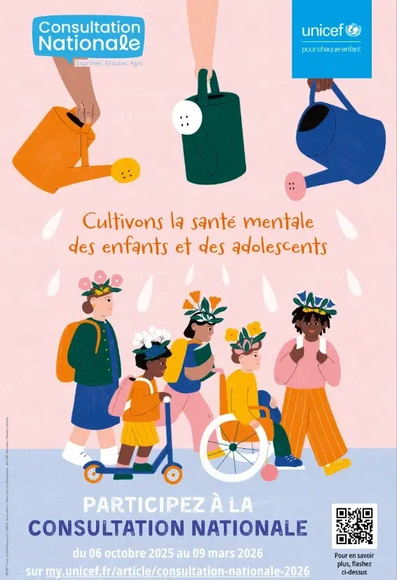 D'octobre 2025 à mars 2026, nous devenons partenaire de l'UNICEF pour relayer un questionnaire et faire participer les 6-18 ans à la Consultation nationale de l'UNICEF France sur le thème "Cultivons la santé mentale des enfants et adolescents !"